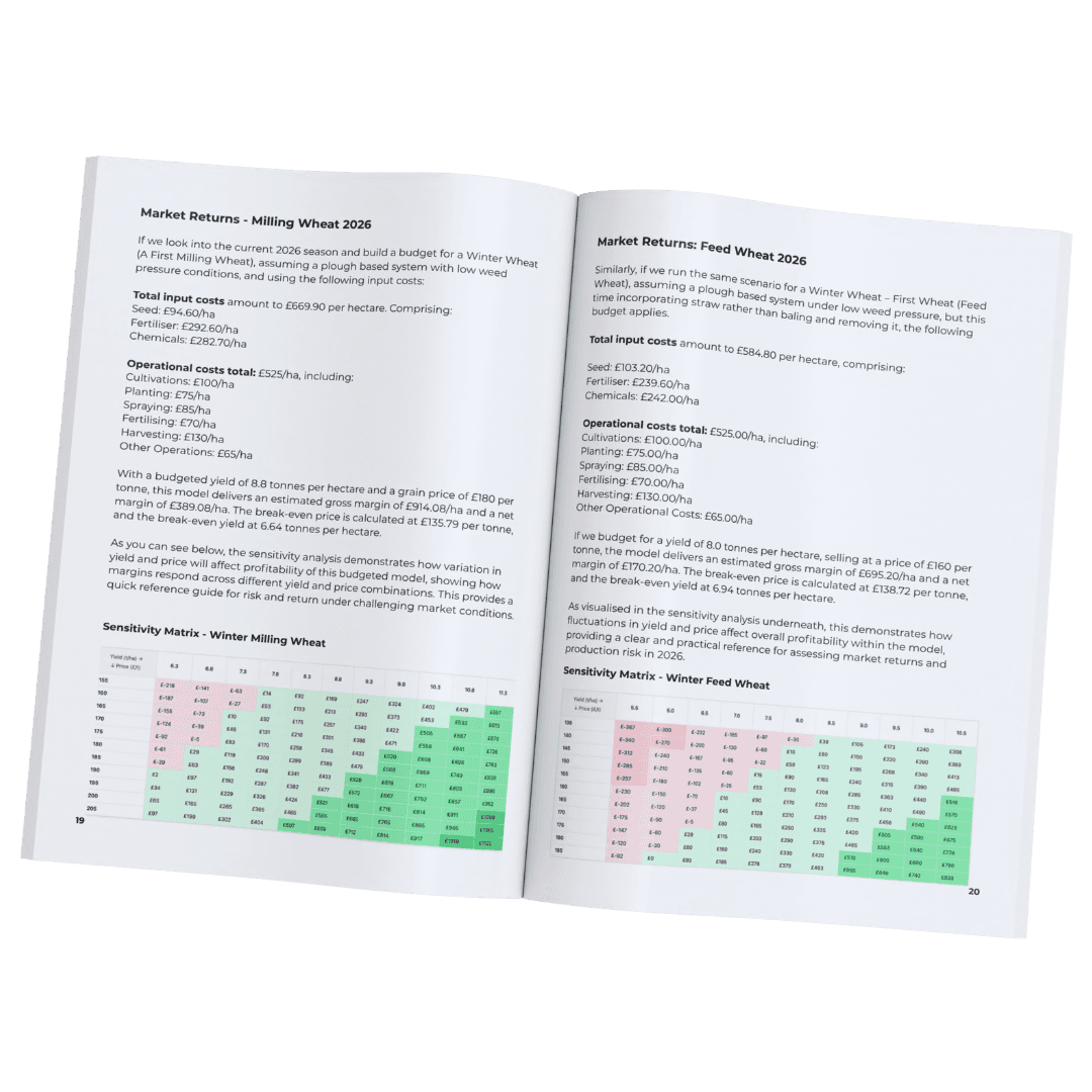 Example gross and net margin models for 2026 (wheat, barley, OSR, beans and spring barley), with yield/price sensitivity tables to help stress-test your own budgets.