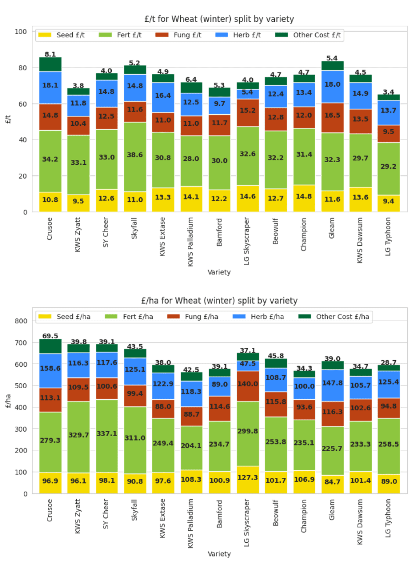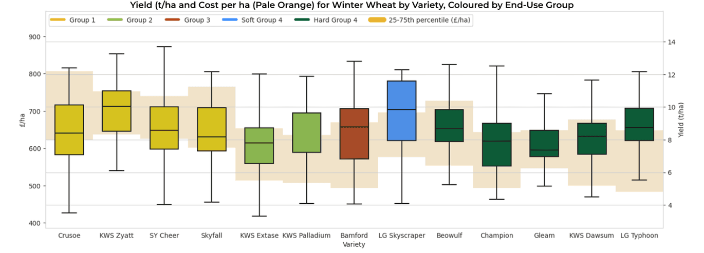 Crusoe sits among the most expensive milling wheats to produce when yield and variable input costs are considered averaging £717/ha. This reflects growers targeting protein over yield, combined with higher fungicide spend due to susceptibility to yellow and brown rust.